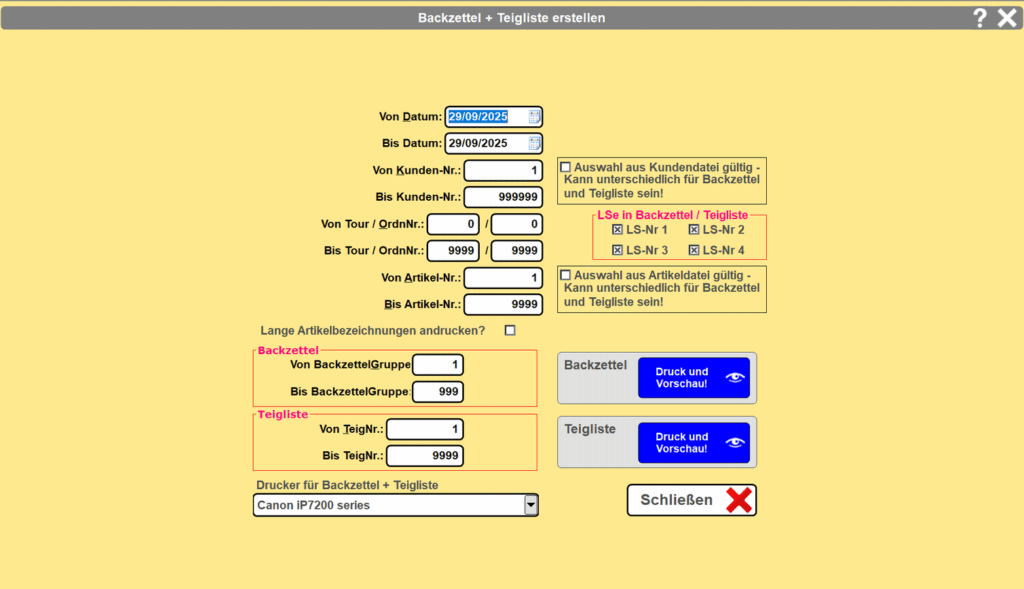 Auf dem gleichen Fenster befindet sich die Möglichkeit, nach dem Backzettel auch die Teigliste zu drucken. Die Teigliste wird nach den Regeln zur Berechnung der Teigliste erstellt.