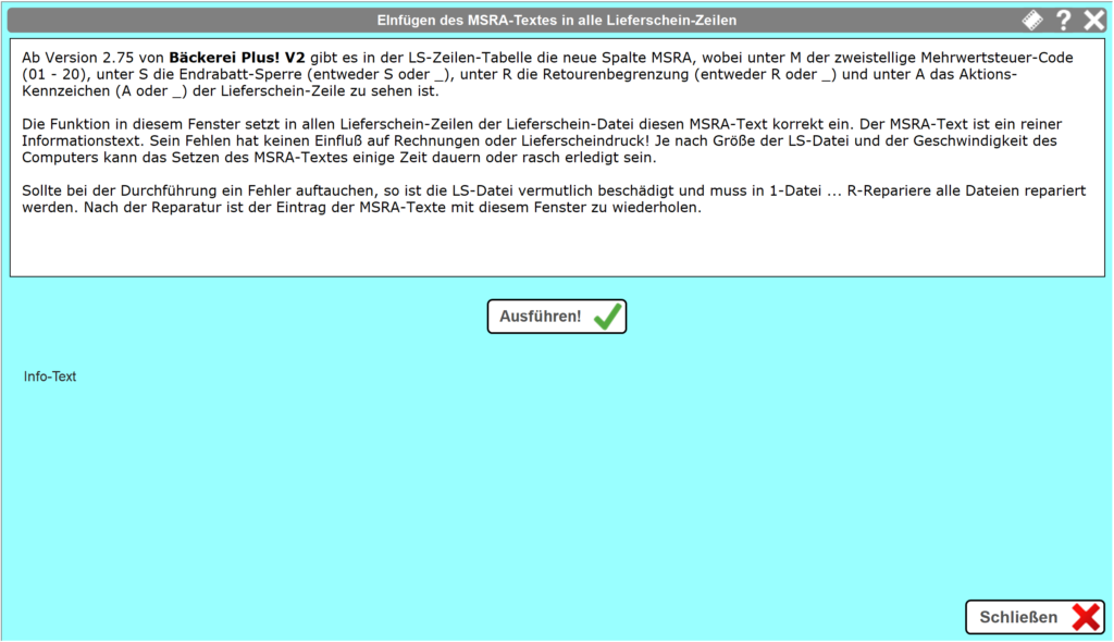 Die Funktion in diesem Fenster setzt in allen Lieferschein-Zeilen der Lieferschein-Datei diesen MSRA-Text korrekt ein. Der MSRA-Text ist ein reiner Informationstext. Sein Fehlen hat keinen Einfluß auf Rechnungen oder Lieferscheindruck! Je nach Größe der LS-Datei und der Geschwindigkeit des Computers kann das Setzen des MSRA-Textes einige Zeit dauern oder rasch erledigt sein.
